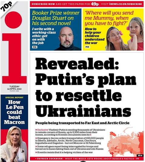 Володимир Путін відправляє тисячі українців за 5500 миль від їхніх будинків, повідомляє «I». Українців вивозять із зон конфліктів у їхній країні та депортують до віддалених куточків Росії. Газета стверджує, що ознайомилася з кремлівськими документами, що наказують вивезти 100 000 людей у Сибір, Арктику та Чечню проти їхньої волі.