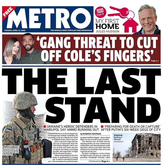 Меtro повідомляє про так звану «останню битву» у Маріуполі, де українські сили готуються до фінального протистояння з російськими військами після того, як закінчилися продовольство та боєприпаси. У статті цитують повідомлення у Facebook, у якому дислокована у місті бригада заявила: «Для деяких із нас це смерть, а для решти – полон».