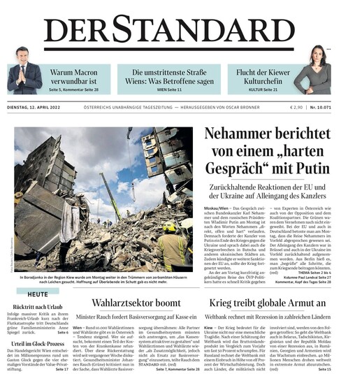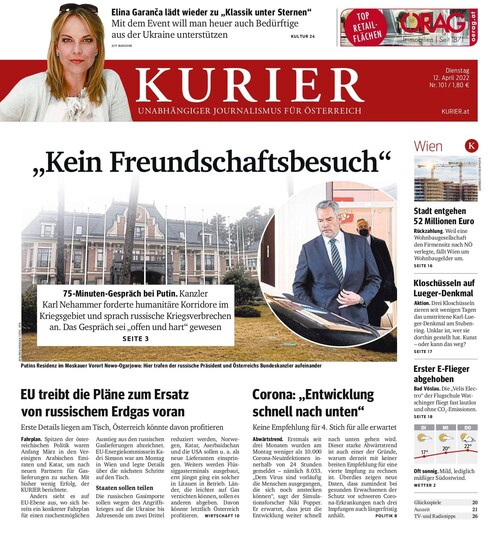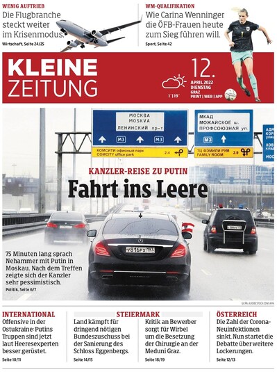 Газета Kurier. Заголовок на фотоколажі: «Дружнього візиту немає». Підзаголовок: «75-хвилинна розмова з Путіним. Канцлер Карл Нехаммер закликав створити гуманітарні коридори в зоні бойових дій і розглянув російські військові злочини. Розмова була «відкритою і жорсткою».