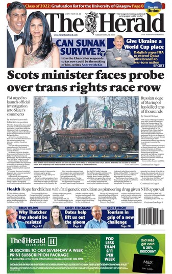 Фото на першій шпальті The Herald: «Українські робітники вантажать зруйнований російській танк на платформу в Андріївці біля Києва. Андріївка була окупована російськими військами на початку україно-російської війни».