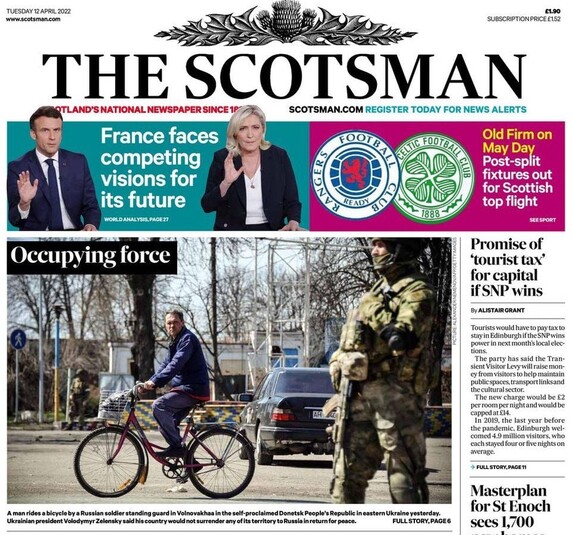 Підпис під фото газети The Scotsman: «Чоловік проїжджає велосипедом за російським солдатом, що стоїть на сторожі у Волновасі – місті в самопроголошеній Донецькій Народній Республіці. Український президент Зеленський сказав що його країна не віддасть жодної зі своїх територій в обмін на мир».