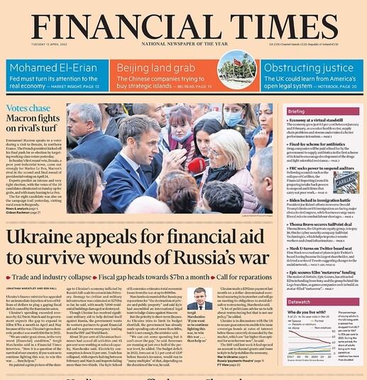 The Financial Times пише, що міністр фінансів України звернувся до західних партнерів із проханням про вливання десятків мільярдів доларів для покриття величезного бюджетного дефіциту, спричиненого російським вторгненням. В інтерв'ю газеті Сергій Марченко каже, що країна перебуває у «найгіршому» фінансовому стані, додаючи: «Якщо ви хочете, щоб ми продовжували вести цю війну... допоможіть нам».