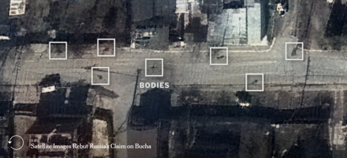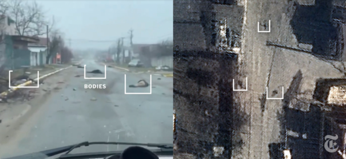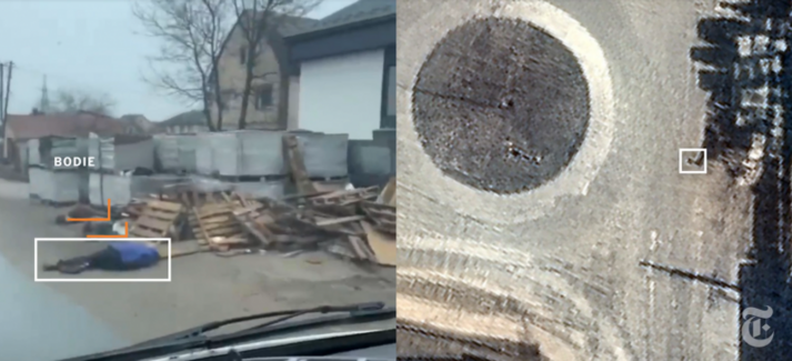 «Об'єкти з'являються точно в тому ж положенні, в якому тіла були виявлені після того, як українські сили повернули Бучу, як видно з кадру від 2 квітня. Подальший аналіз показує, що об'єкти залишалися в такому положенні більше ніж три тижні», – ідеться в публікації.
