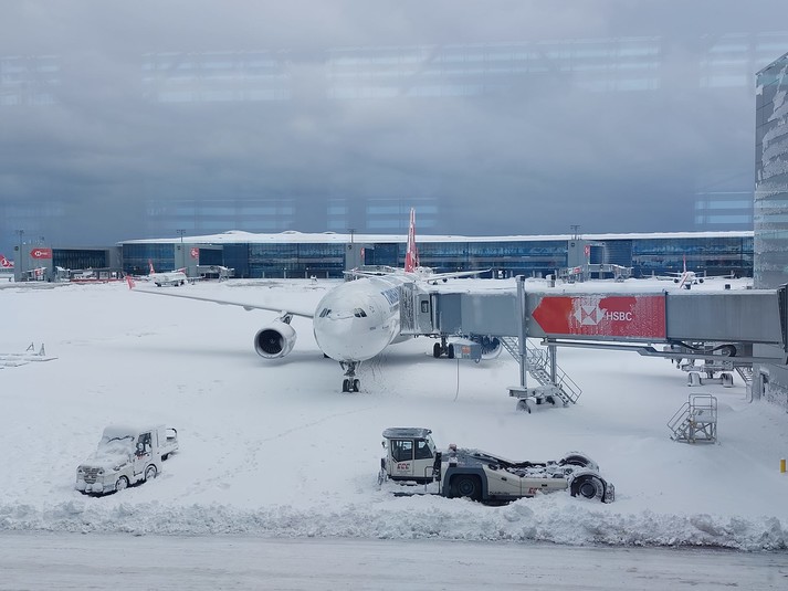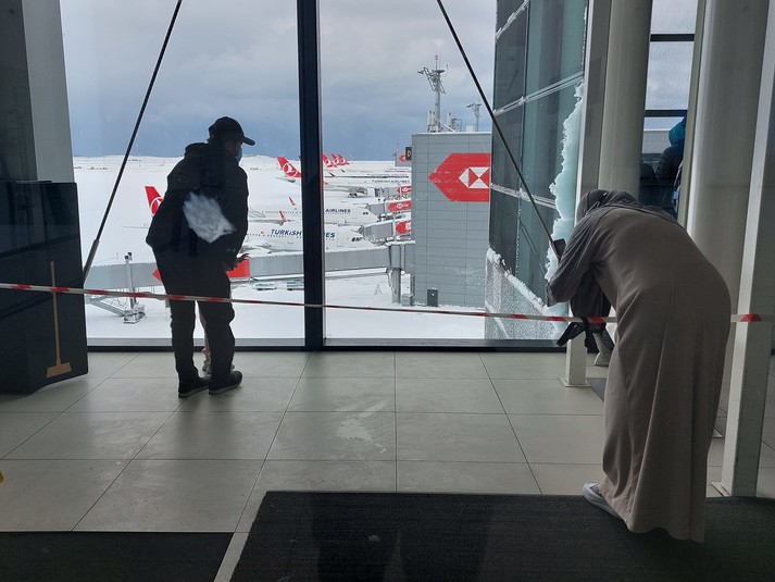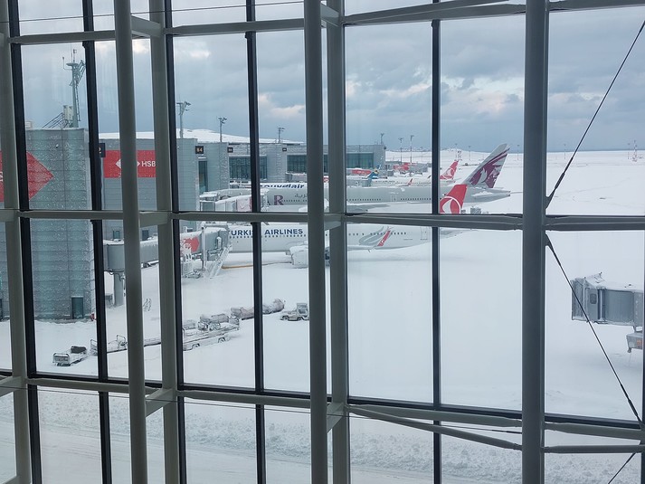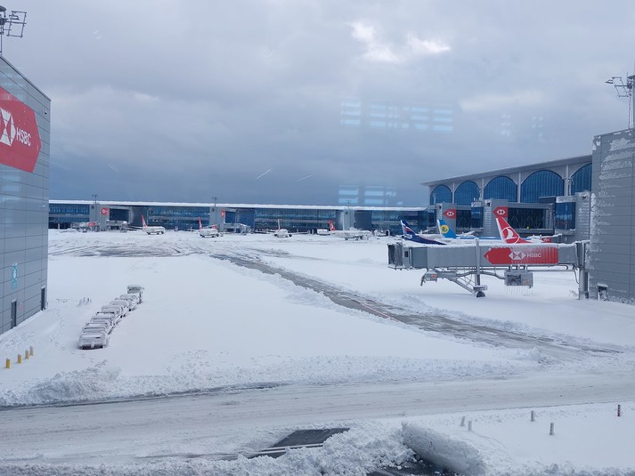 Киянка Катерина Колонович сьогодні, 25 січня, опублікувала у Facebook низку фото та відео з аеропорту Стамбула, де перебуває в очікуванні свого рейсу. На фото видно, що перони аеропорту ще не встигли до кінця розчистити після потужного снігопаду. Частина літаків, що вже приєднані до пасажирських рукавів, стоять записані снігом та, судячи із зображень, до вильоту не готуються.