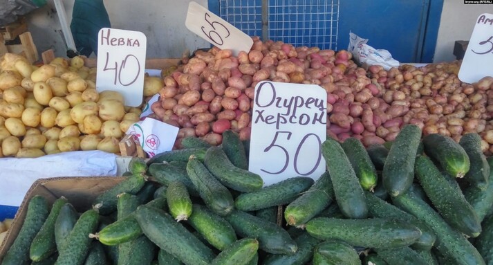 Так, першими продуктами, які рекламували як «херсонські», стали молода картопля та огірки. Ціна не надто відрізняться від звичної в Севастополі, 50-60 рублів за кілограм.