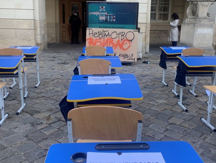 На площі Ринок вони встановили близько 40 шкільних парт, на яких розмістили плакати з гаслами. Вимога батьків – відновити очне навчання у школах. Вони кажуть, що діти вдома не можуть ефективно вчитися, особливо, якщо в родині кілька дітей і кожному з них для онлайн-навчання потрібен комп’ютер. Крім цього, батьки змушені залишатися вдома з першокласниками.
