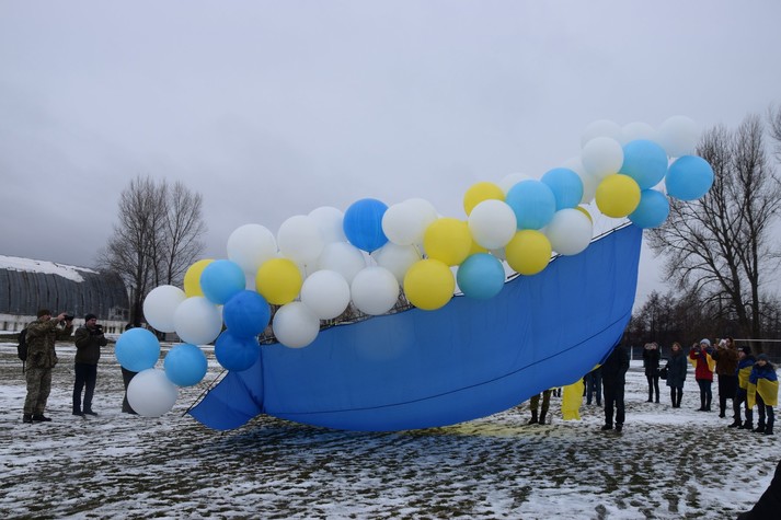 Полотнище розміром шість на одинадцять метрів було виготовлене волонтерами Донеччини і передане у дарунок жителям сусідньої області як символ єдності України. Прапор також був оздоблений кількома десятками повітряних куль.