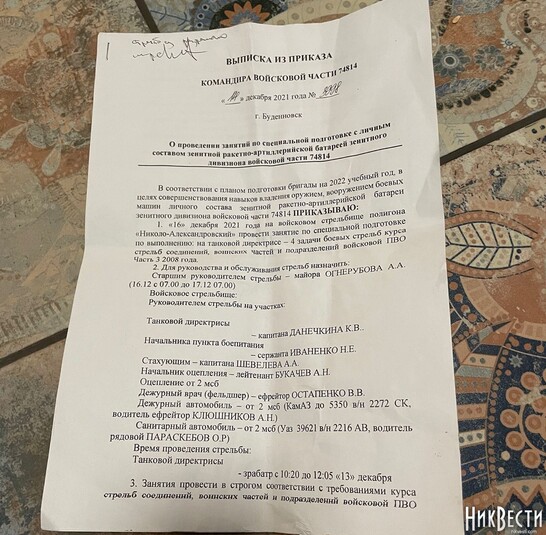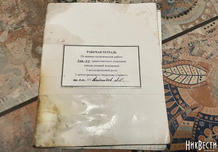На обкладинці зошита з конспектами зазначено, що це «робочий зошит з військово-політичної роботи 3КВ-КО гранатометного відділення взводу вогневої підтримки 3 мотострілецької роти 1 мотострілецького батальйону (гірського)».