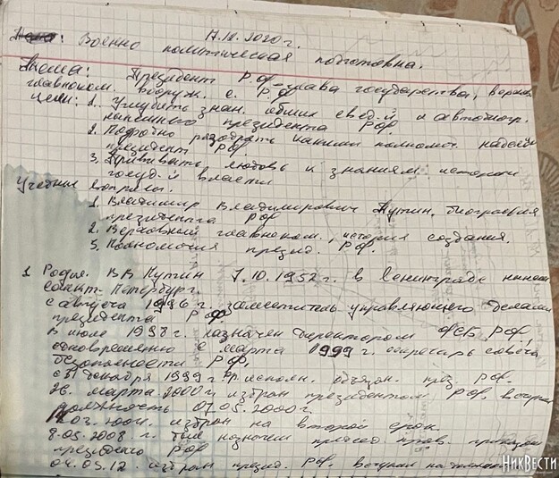 У зошиті докладно законспектована біографія Володимира Путіна: коли і де народився, де і коли працював, коли був обраний та переобраний президентом РФ.