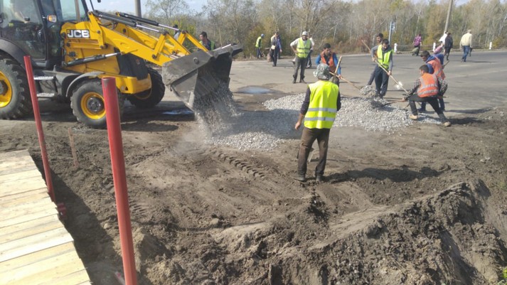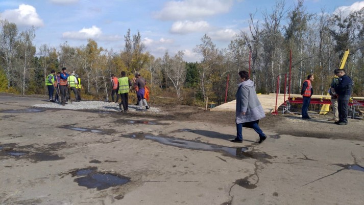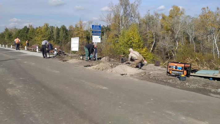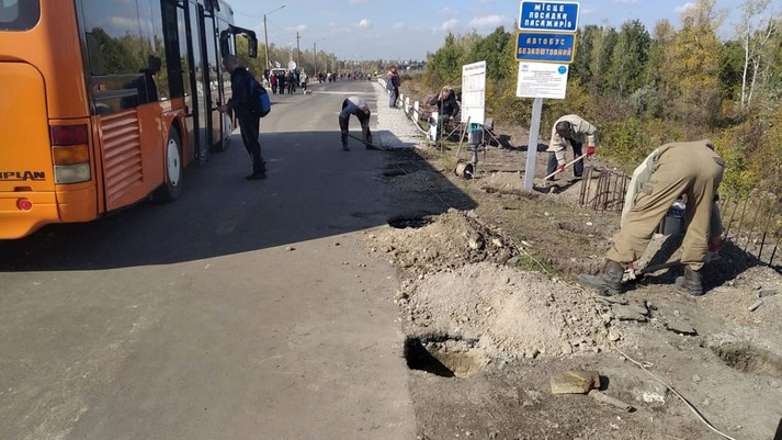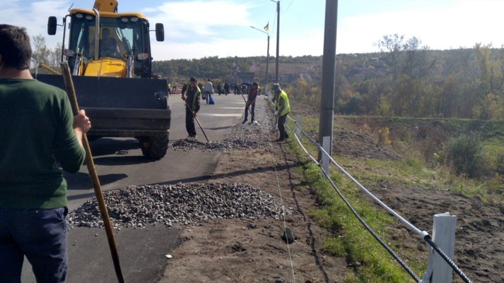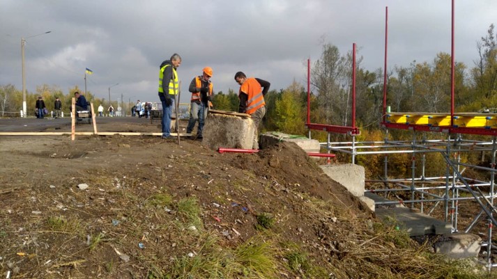 Зазначається, що українська сторона виконала роботи з монтажу тимчасового пішохідного обхідного мосту. Наразі будівельники здійснюють монтаж огорожі та настилу на обхідному мосту. Також здійснюються роботи з розчищення узбіч, підготовки до асфальтування дороги та будівництва автобусних зупинок.