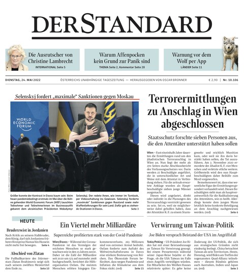 Австрія. Der Standard. «Зеленський закликав до «максимальних» санкцій проти Москви». Контраст у Давосі навряд чи міг бути більшим: на Всесвітньому економічному форумі цього року учасники у ділових костюмах заворожено слухали президента України Володимира Зеленського. Як завжди в камуфляжі, він звернувся до їхньої совісті за допомогою відеозв'язку. Зеленський закликав до «максимальних» санкцій проти Росії та збільшення постачання зброї для своєї країни. Цьому в Давосі аплодували стоячи