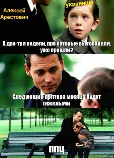 Радник керівника Офісу президента Олексій Арестович та його обіцянки, що найважча фаза, а то й сама війна завершиться за «два-три тижні, максимум місяць» спричинили хвилю мемів у соцмережах. Запустив її сам Арестович, опублікувавши дотепний мем та притчу на своїй сторінці у Facebook.