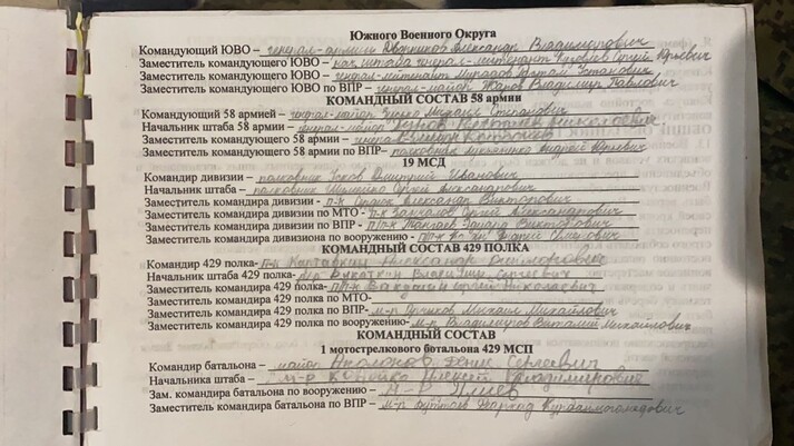 «Як вказують документи, раніше тут стояли солдати росармії з військової частини 43057, яка базується в Північній Осетії – Аланії, місто Владікавказ, селище Спутник. «Рабочая тетрадь командира отделения Мамаева Р.М.» та «Журнал учета боевой подготовки» вказує прізвища командирів та особового складу, починаючи від Южного воєнного округу РФ до мотострілкового батальйону військової частини 43057. А «Сопроводительный лист на перевозку материальных ценностей», датований 21 листопада 2021 року, фіксує кількість боєприпасів та прізвище відповідальних за БМП-3», – ідеться у повідомленні.