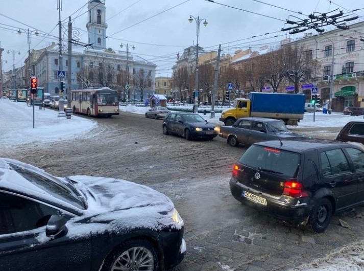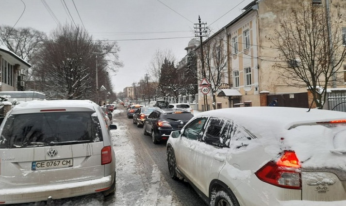 Сильний снігопад заблокував роботу "Калинівського ринку". Снігова негода скувала центр Чернівців, найбільше скупчення автомобілів зараз - у центральній частині міста. Зокрема, вулиці Головна, Героїв Майдану та низці доріг у районі Соборної площі, повідомляє promin.cv.