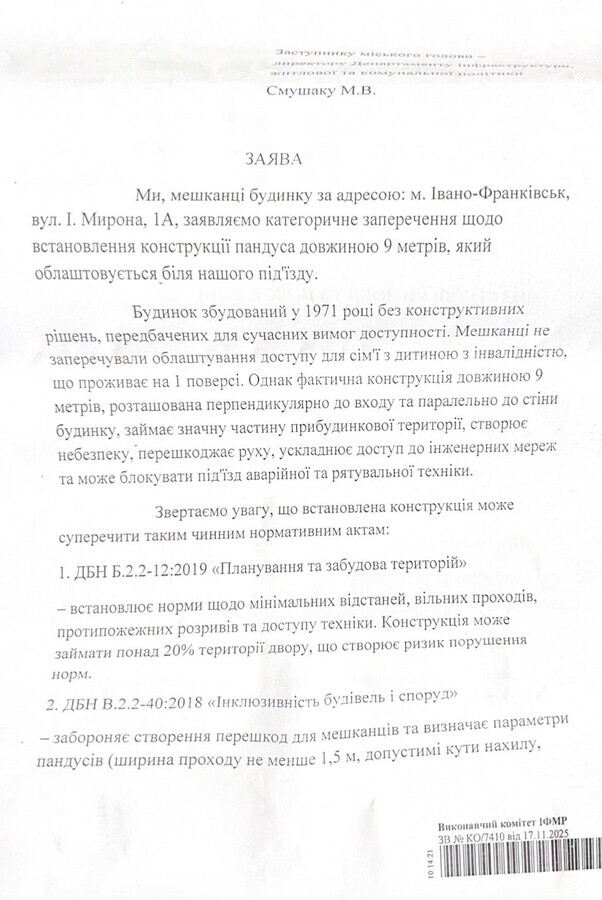 До свого допису заступник міського голови Івано-Франківська додав скан заяви мешканців будинку, у якій вони виступили проти встановлення пандуса. «Заявляємо категоричне заперечення щодо встановлення конструкції пандуса довжиною 9 метрів, який облаштовується біля нашого під’їзду. Будинок збудований у 1971 році без конструктивних рішень, передбачених для сучасних вимог доступності. Мешканці не заперечували облаштування доступу для сім’ї з дитиною з інвалідністю, що проживає на 1 поверсі», – йдеться в заяві.