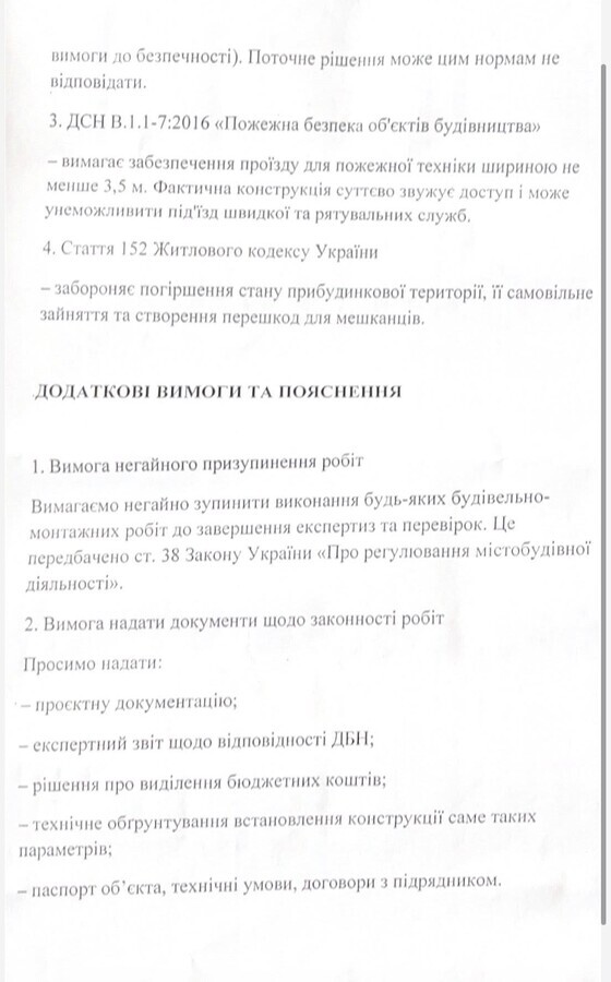 Крім цього, мешканці вважають, що пандус буде перешкоджати руху та може блокувати доступ до інженерних мереж і рятувальної техніки. Також вони вимагають проведення додаткової перевірки та експертизи.