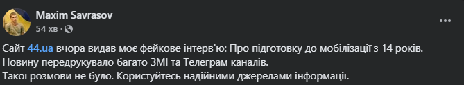 «Сайт 44.ua вчора видав моє фейкове інтерв'ю: Про підготовку до мобілізації з 14 років. Новину передрукувало багато ЗМІ та Телеграм каналів. Такої розмови не було. Користуйтесь надійними джерелами інформації», – заявив він.