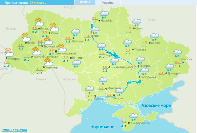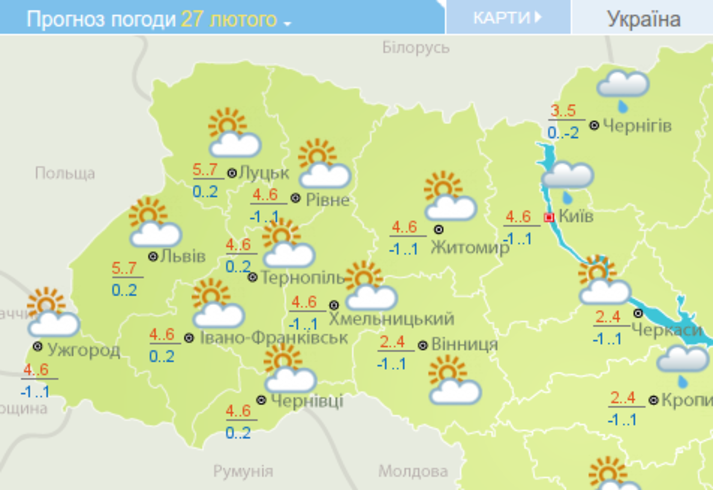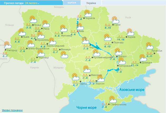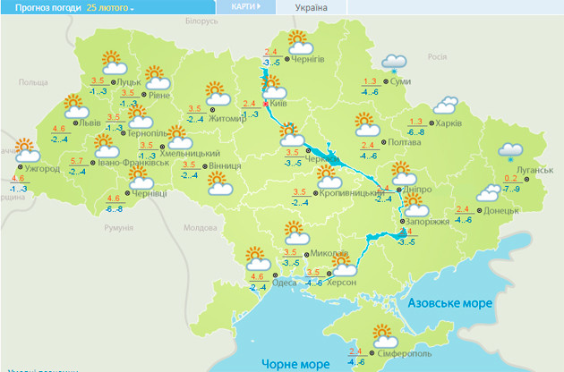 Температура вночі 25 лютого 1-6° морозу, у східних областях та в Карпатах до 11° морозу, 26 лютого в Україні близько 0°; вдень 1-6° тепла, 26 лютого на Закарпатті до 10° тепла.