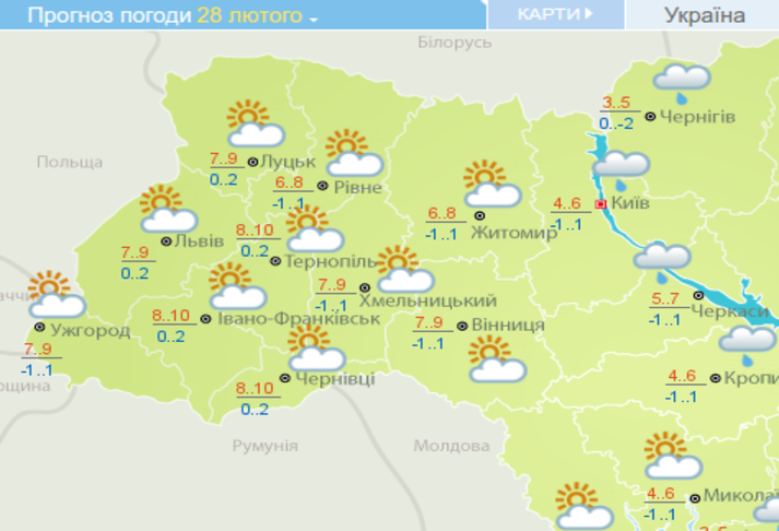 Згідно з прогнозом на 27- 28 лютого, в Україні, крім західних, Одеської та Миколаївської областей, невеликі опади.
