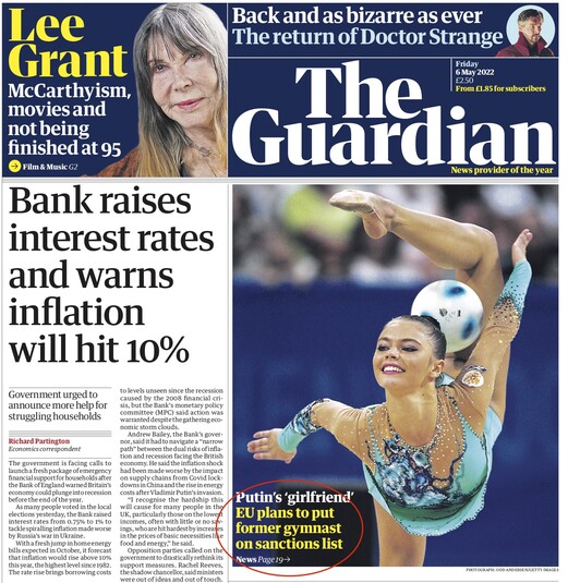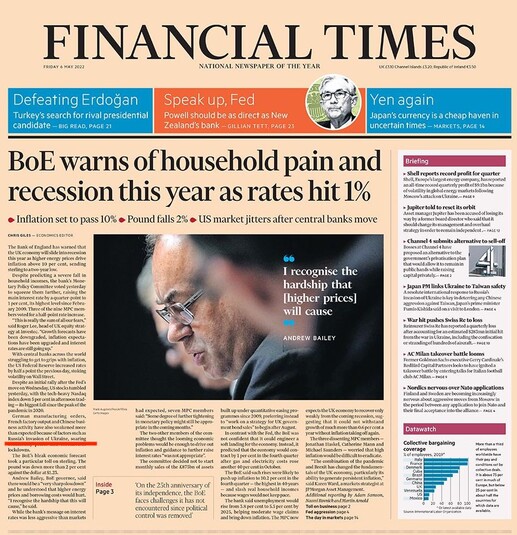 Попередження Банку Англії, що інфляція перевищить 10%, фігурує на багатьох перших шпальтах. Financial Times повідомляє, Банк заявив, що економіка Великої Британії «скотиться до рецесії» цього року, оскільки вищі ціни на енергоносії збільшать інфляцію. Це насамперед пов'язано з агресією Росії проти України та санкціями, що вводяться проти РФ.