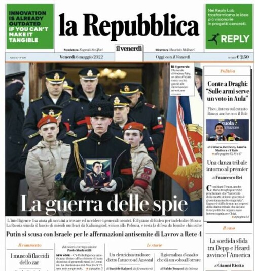 «Війна шпигунів» – головний заголовок La Repubblica. Розвідка США допомагає українцям знаходити та вбивати ворожих генералів. Це план Байдена щодо ослаблення Москви.