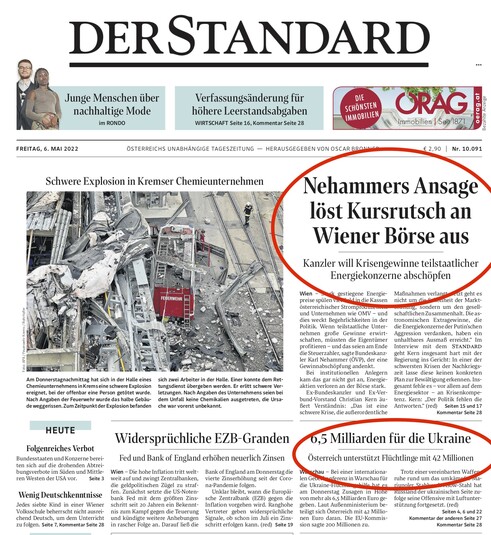 Австрія. Газета Der Snadart вийшла з темою: «6,5 млрд для України». У Варшаві, на міжнародній донорській конференції, збирали гроші на підтримку України. Загалом вдалося акумулювати 6,5 мільярда євро. За даними МЗС, Австрія внесла 42 млн євро.
