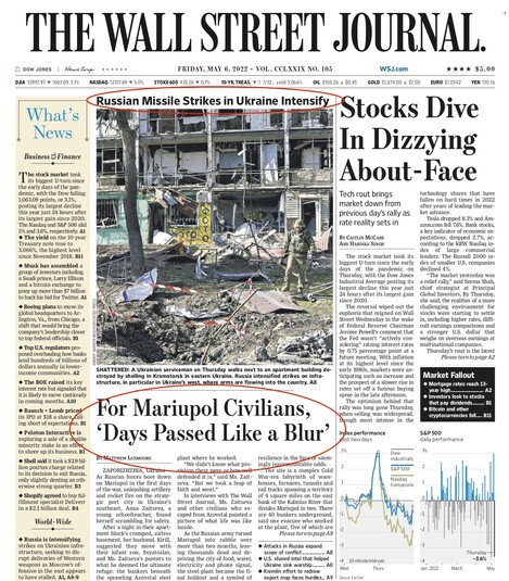 WSJ. Головний заголовок: «Російські ракетні удари по Україні посилюються». Підпис під фото: Український військовослужбовець у четвер іде поруч із зруйнованим внаслідок обстрілу багатоквартирним будинком у Краматорську на сході України. Росія посилила удари по інфраструктурі, зокрема на заході України, звідки до країни надходить зброя.