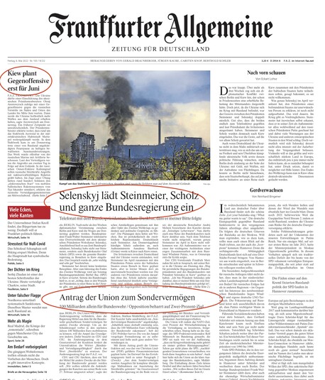 Німеччина. Газета FAZ: Зеленський запрошує Штайнмайєра, Шольца та весь федеральний уряд». Після більш ніж тритижневого дипломатичного конфлікту між Берліном та Києвом у четвер усе налагодилося. Федеральний президент Франк-Вальтер Штайнмаєр три чверті години розмовляв телефоном із президентом України Володимиром Зеленським. Тоді в Офісі федерального президента заявили, що Зеленський запросив не лише Штайнмайєра, а й канцлера Олафа Шольца та весь федеральний уряд відвідати Київ.