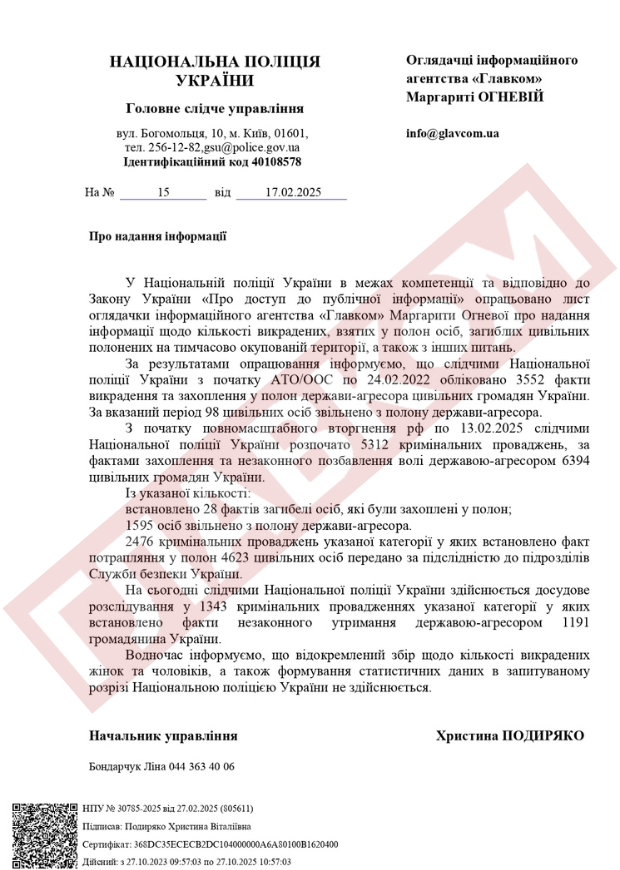Після початку повномасштабного вторгнення, з 24 лютого 2022 року по 13 лютого 2025 року, Національна поліція відкрила 5312 кримінальних проваджень щодо незаконного позбавлення волі 6 394 громадян України.
