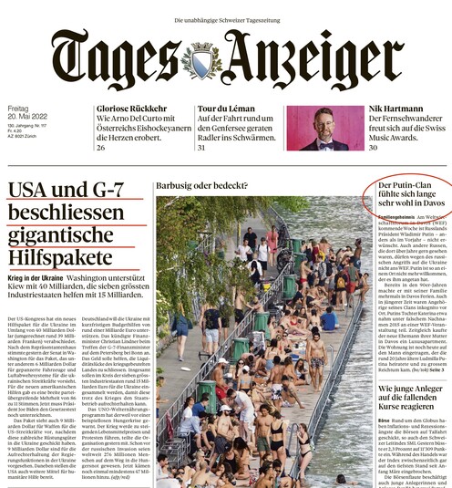 Швейцарія. Tages-Anzeige: «Клан Путіна тривалий час почував себе в Давосі дуже комфортно». На Всесвітньому економічному форумі в Давосі (WEF) наступного тижня президента Росії Володимира Путіна – на відміну від минулого року – не чекають. Іншим росіянам, яких там вітали протягом багатьох років, також не пускають на WEF через напад Росії на Україну. Путіну більше не раді у місці, яке його приваблювало.