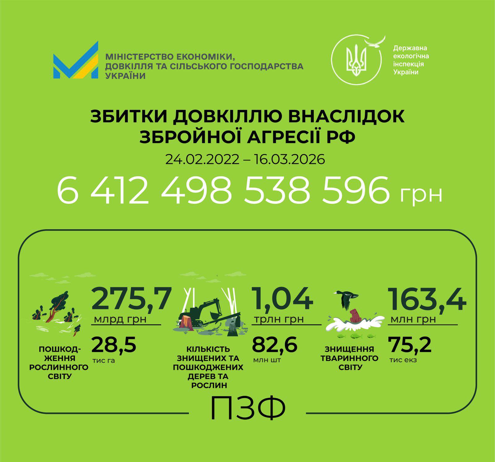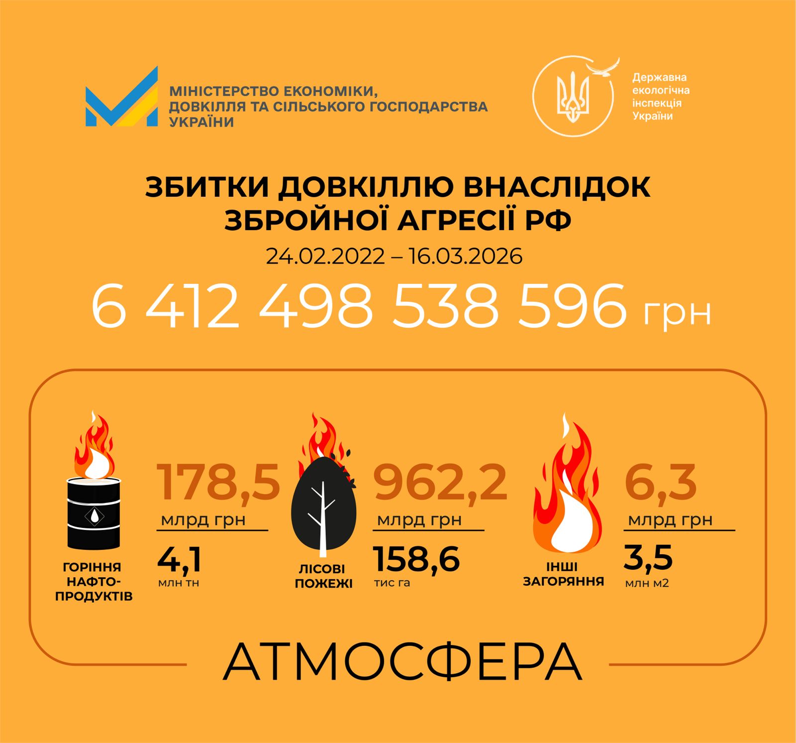 Загальна сума збитків, завданих природному середовищу, становить майже 6,4 трлн грн. Зокрема: