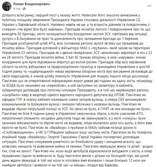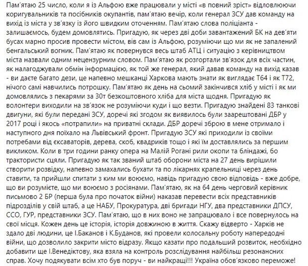 «Єдине за що мене можна покарати з початку війни – це те що я 24 видав зброю людям. Разом з тим вважаю, що якби я цього не зробив, Харків був би окупований. Стосовно будь-яких інших звинувачень я погоджуюсь на проходження дослідження із задіянням поліграфу, або будь-яких інших опитувань. Більше того, враховуючи що Ви публічно оприлюднили інформацію стосовно мене пропоную будь-який публічний формат», - написав він.