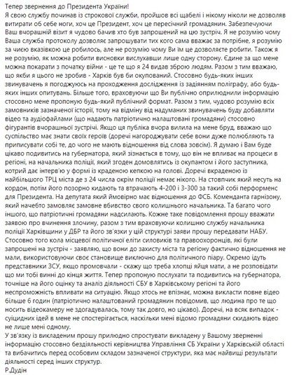 «У зв’язку із викладеним прошу прилюдно спростувати викладену у вашому зверненні інформацію стосовно бездіяльності керівництва Управління СБ України у Харківській області та вибачитись перед особовим складом зазначеної структури, яка має найвищі результати діяльності серед інших структур», – звернувся Дудін до президента.