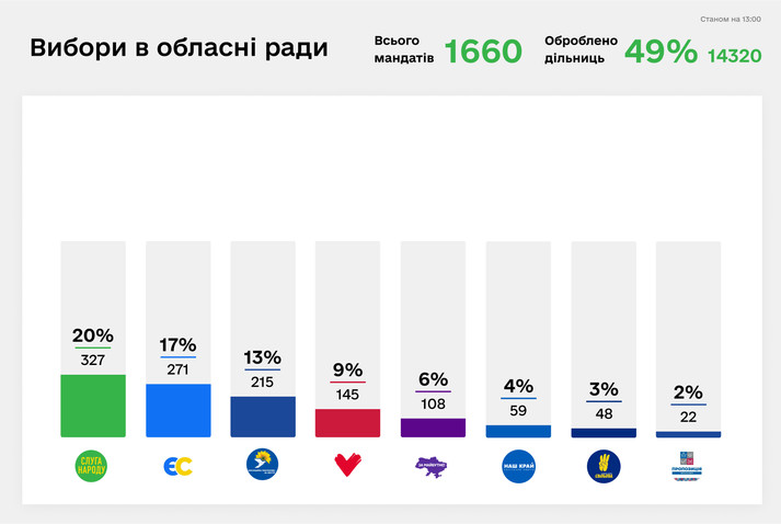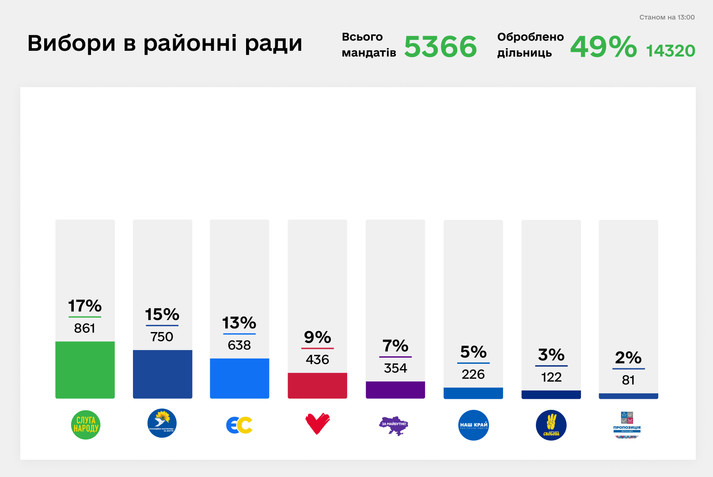Після обробки результатів із 49% дільниць «Слуга Народу» має 17% місць у районних радах