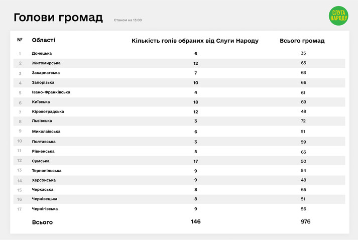 За його словами, «Слуга Народу» в 17 областях отримає також 146 місць (15%) голів ОТГ (дані з решти областей ще не обраховані). Після обробки результатів із 49% дільниць «Слуга Народу» має 20% місць в обласних радах, 17% — у районних, що є найвищими показниками серед усіх партій.