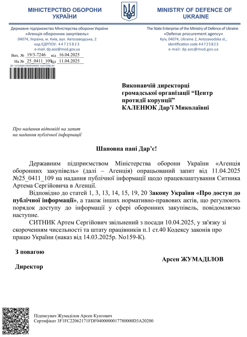 «Ситник Артем Сергійович звільнений із посади 10.04.2025, у зв’язку зі скороченням чисельності та штату працівників п.1 ст.40 Кодексу законів про працю України (наказ від 14.03.2025р. No159-К)», – зазначив Жумаділов у відповіді.