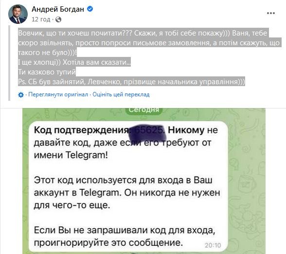 Колишній голова Офісу президента Андрій Богдан заявив, що його обліковий запис у Telegram хотіли зламати. Про це він написав на сторінці у Facebook.