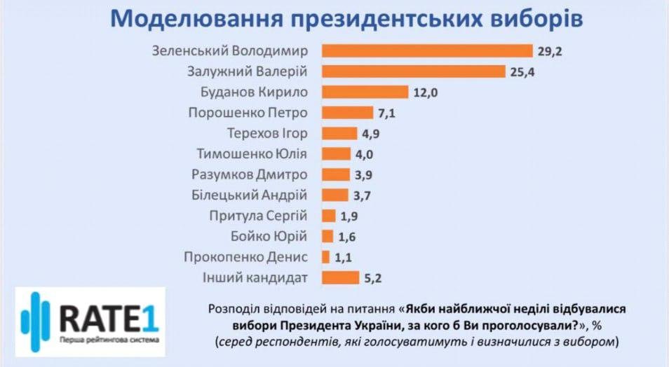 Лідером рейтингу потенційних кандидатів залишається чинний президент Володимир Зеленський – його підтримують 29,2% опитаних. Другу позицію посідає колишній Головнокомандувач ЗСУ Валерій Залужний із результатом 25,4%.