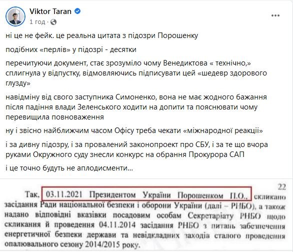 «Ні це не фейк. Це реальна цитата з підозри Порошенку. Подібних «перлів» у підозрі – десятки, перечитуючи документ, стає зрозуміло чому Венедиктова «технічно» сплигнула у відпустку, відмовляючись підписувати цей «шедевр здорового глузду» на відміну від свого заступника Симоненко. Вона не має жодного бажання після падіння влади Зеленського ходити на допити та пояснювати, чому перевищила повноваження», – написав Таран у Facebook.