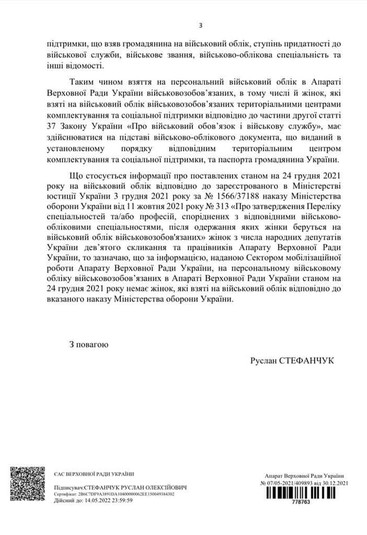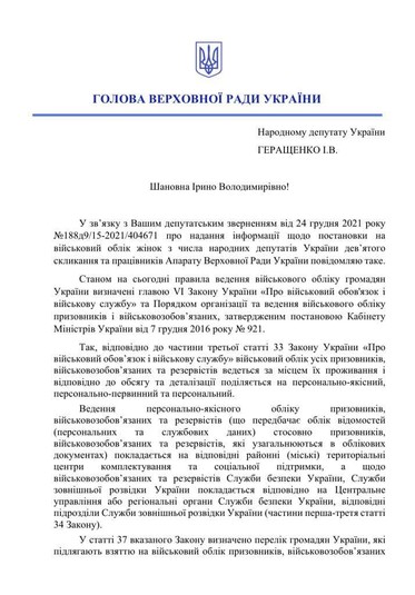 «У скандальному наказі Міноборони про військовий облік жінок йшлося, що це має відбуватися у військкоматах за місцем реєстрації або відділи кадрів за місцем роботи. Ми з колегами відразу звернулися до голови Верховної Ради, аби отримати інформацію про постановку на військовий облік депутаток і працівниць апарату. З’ясувалося, що у відділі кадрів парламенту на військовому обліці не стоїть жодної жінки», – розповіла депутктка та оприлюднила офіційну відповідь спікера парламенту Руслана Стефанчука.