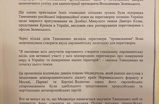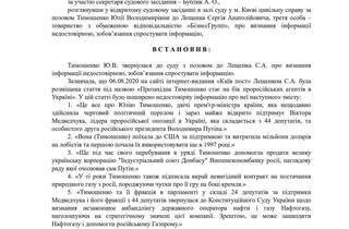 «Тимошенко спочатку подала до мене не за адресою - в Печерський районний суд міста Києва (саме у цьому суді без будь-яких правових підстав тривав 5 років інших судовий процес – Медведчука проти мене). ЮВТ просто намагалася повторити фінт кума Путіна. Тимошенко подала абсолютно абсурдну за змістом заяву про забезпечення позову - прагнула заборони мені поширювати у будь-який спосіб інформацію щодо підтримки Тимошенко з боку Віктора Медведчука», – розповів Лещенко.