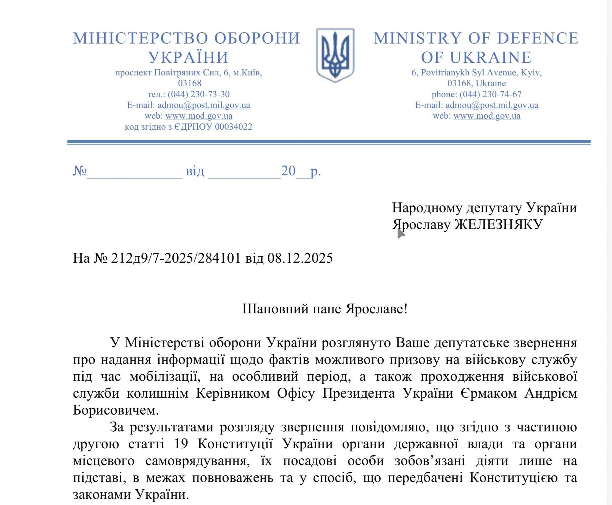 «Інформуємо, що станом на момент розгляду депутатського звернення, громадянин України Єрмак Андрій Борисович до будь-якого територіального центру комплектування та соціальної підтримки щодо бажання проходити військову службу під час мобілізації, на особливий період або за контрактом не звертався», – йдеться документі.