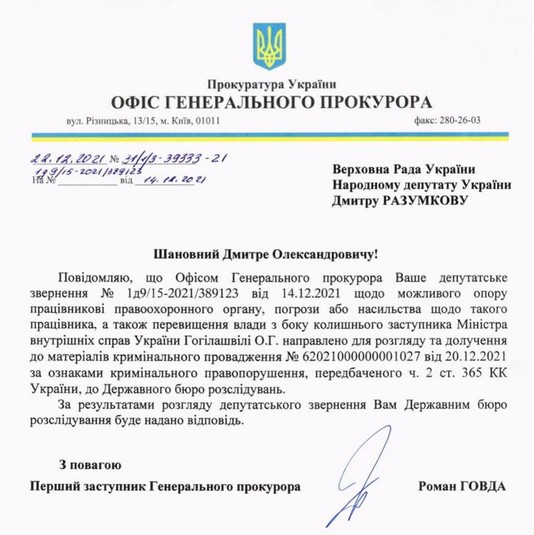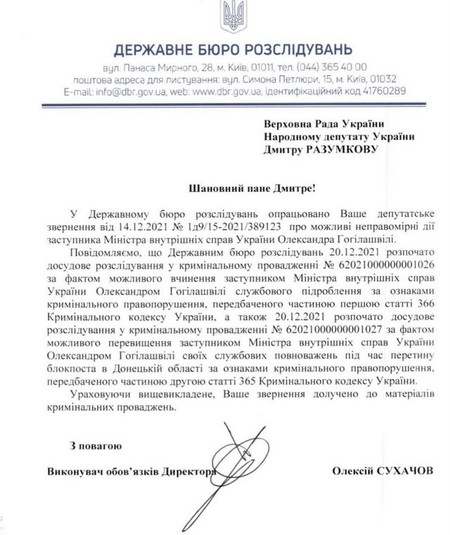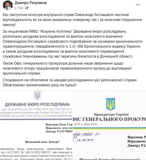 «Ексзаступник міністра внутрішніх справ Олександр Гогілашвілі нестиме відповідальність як за свою аморальну поведінку, так і за можливе порушення закону! За ініціативою МФО «Розумна політика» Державне бюро розслідувань розпочало досудове розслідування за фактом можливого вчинення Олександром Гогілашвілі службового підроблення за ознаками кримінального правопорушення, передбаченного ч. 1 ст. 366 Кримінального кодексу України, а також досудове розслідування за фактом можливого перевищення службових повноважень під час перетину блокпоста в Донецькій області», – написав Разумков.