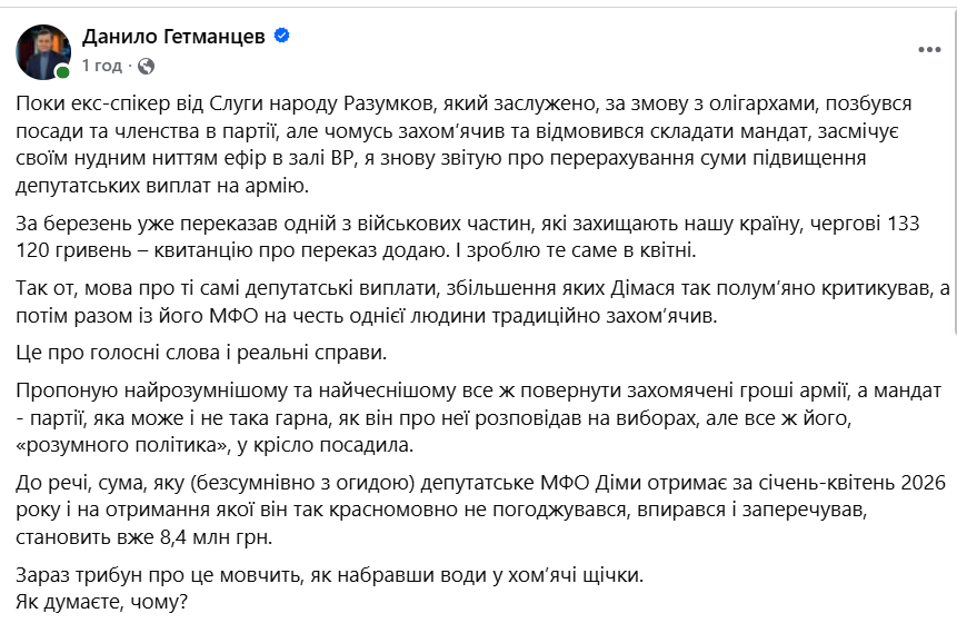 «Поки ексспікер від «Слуги народу» Разумков, який заслужено, за змову з олігархами, позбувся посади та членства в партії, але чомусь захом’ячив та відмовився складати мандат, засмічує своїм нудним ниттям ефір в залі ВР, я знову звітую про перерахування суми підвищення депутатських виплат на армію», – написав Гетманцев.