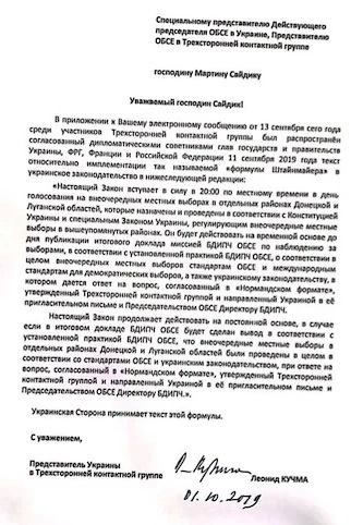 У них, зокрема, йдеться про те, що «цей Закон (вочевидь, мова про спеціальний закон, який має бути підготовлений на заміну нинішнього закону «Про особливий порядок місцевого самоврядування в окремих районах Донецької і Луганської областей», термін дії якого спливає наприкінці 2019 року) вступає в силу о 20:00 за місцевим часом у день голосування на позачергових місцевих виборах в окремих районах Донецької і Луганської областей, які призначені і проведені відповідно до Конституції України і спеціальним законом України, який регулює позачергові місцеві вибори у вищезгаданих районах…». Повідомляється також, що він матиме тимчасову дію до дня публікації підсумкового звіту Бюро демократичних інститутів та прав людини ОБСЄ (БДІПЛ ОБСЄ). В разі, якщо ОБСЄ визнає результати виборів демократичними, то закон щодо особливостей місцевого самоврядування починає діяти на постійній основі.