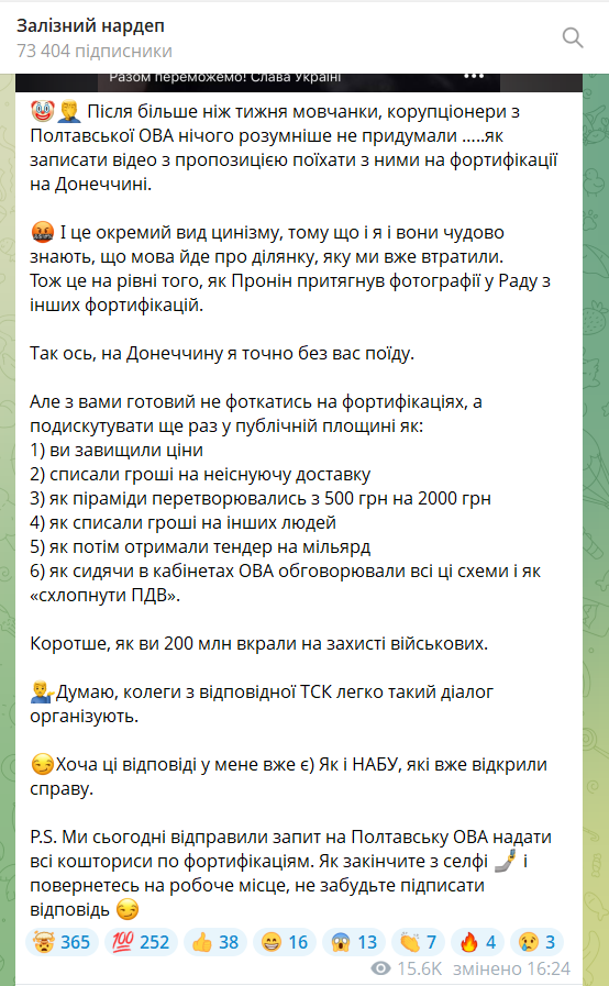 Зауважимо, народний депутат Ярослав Железняк оприлюднив розслідування щодо будівництва фортифікацій на Покровському напрямку Донеччини. За його словами, під час робіт, які виконували на замовлення Полтавської ОВА, посадовці могли переплатити значно більше ніж 200 млн грн за укриття для військових.
