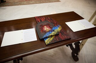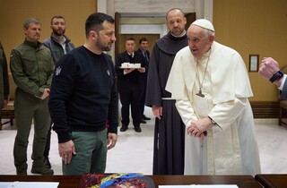 За традицією, лідери обмінялися подарунками. Папа Римський Франциск подарував президенту Зеленському бронзову скульптуру, яка уособлює оливкову гілку – символ миру. Він також презентував Документ 2019 року про людське братерство за мир у всьому світі та життя разом та том під назвою «Енцикліка про мир в Україні».