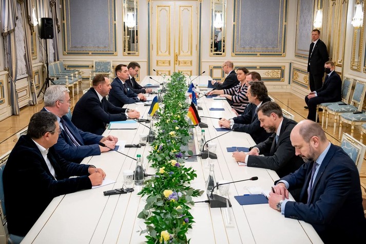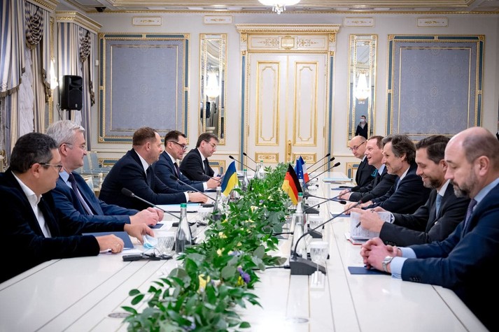 «Керівник Офісу Президента Андрій Єрмак розпочав зустріч із радником канцлера Німеччини з питань зовнішньої політики Єнсом Пльотнером і дипломатичним радником президента Франції Еммануелем Бонном, які прибули в Україну з візитом», – ідеться в повідомленні.
