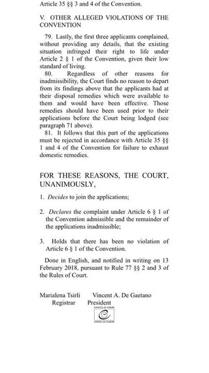У результативній частині вироку суду йдеться: «Враховуючи тривалий конфлікт, Україна позбавлена можливостей забезпечити належне функціонування судів і виплату пенсій на території поза її контролем».