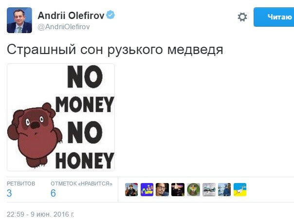 2016 року очільник посольства України у Фінляндії Андрій Олефіров неодноразово висміював агресивну політику російського сусіда, використовуючи меми та крилаті фрази.